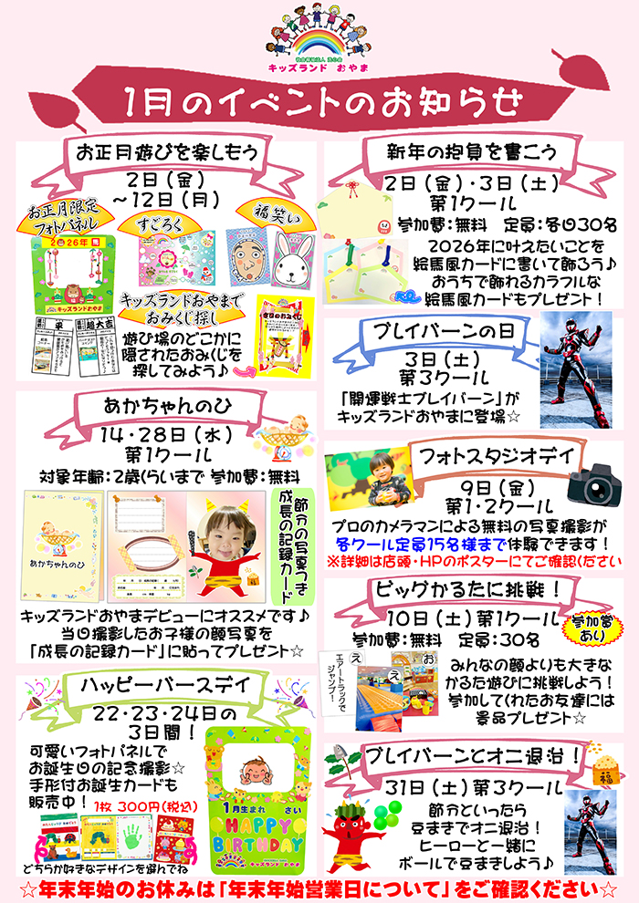 キッズランドおやま 1月イベント案内、施設定休日と団体貸し切り日のお知らせ