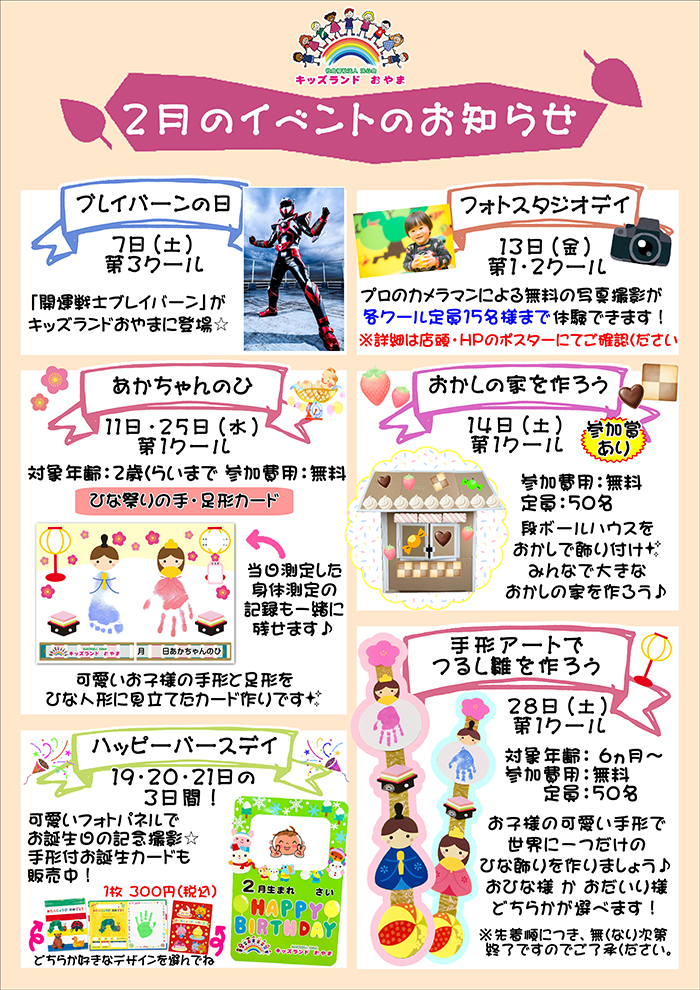 キッズランドおやま 2月イベント案内、施設定休日と団体貸し切り日のお知らせ