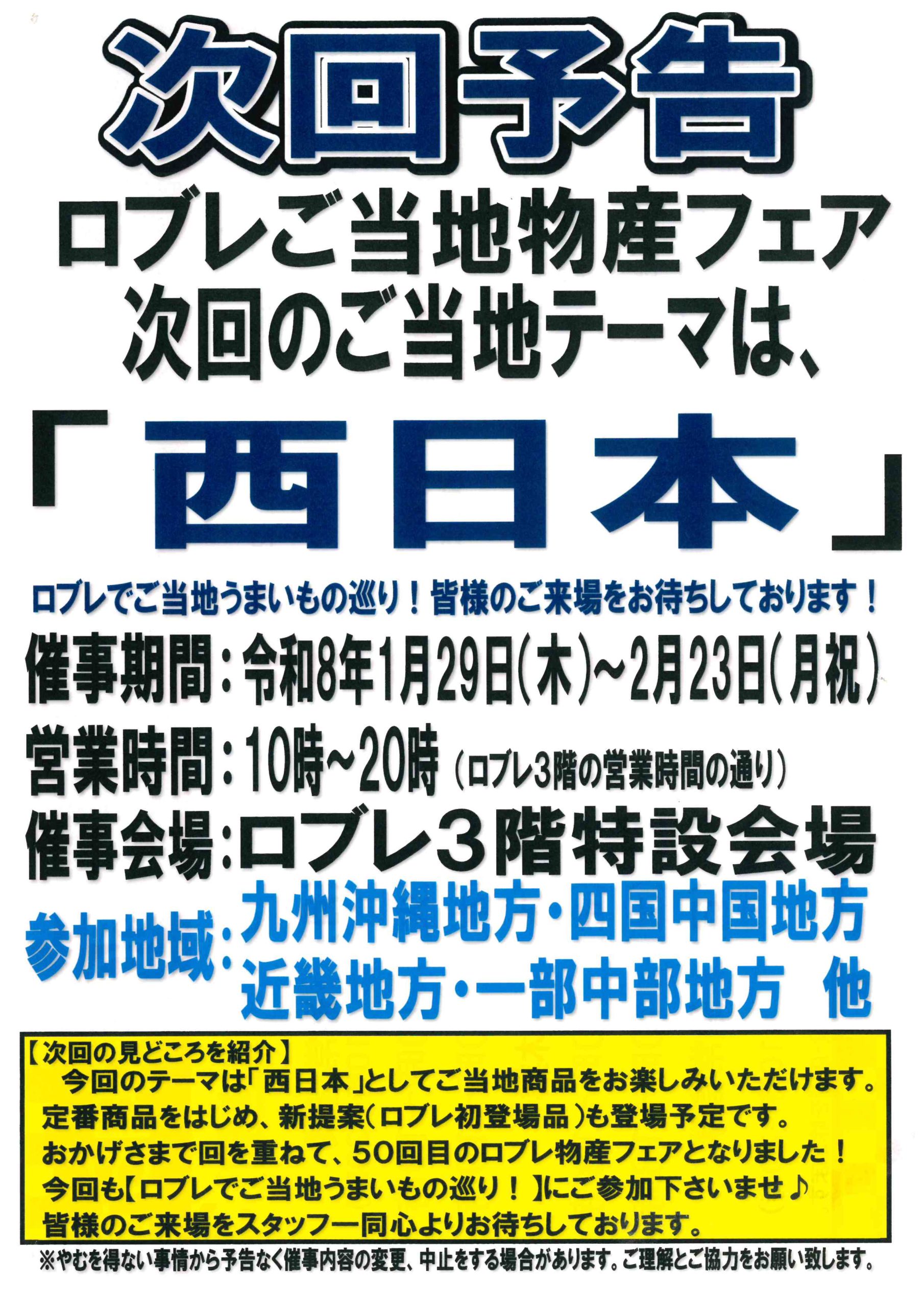 ロブレご当地物産展 「西日本うまいものフェア」開催 のお知らせ【1月29日(木)~2月23日(月祝)まで】